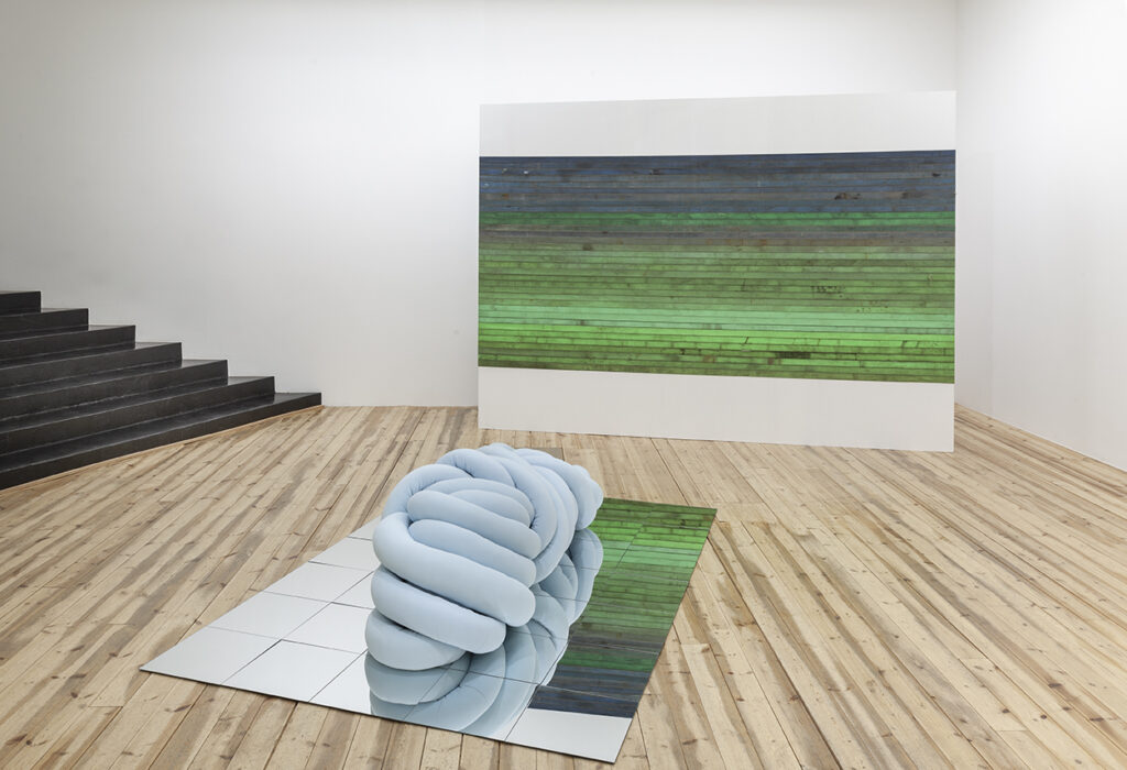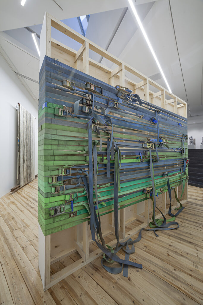 The color-coordinated and precisely horizontally stacked cargo straps stretched across the wall in the space create a picturesque, landscape-like view, while the material nature of the work invites viewers to examine the meanings conveyed by the material itself.
